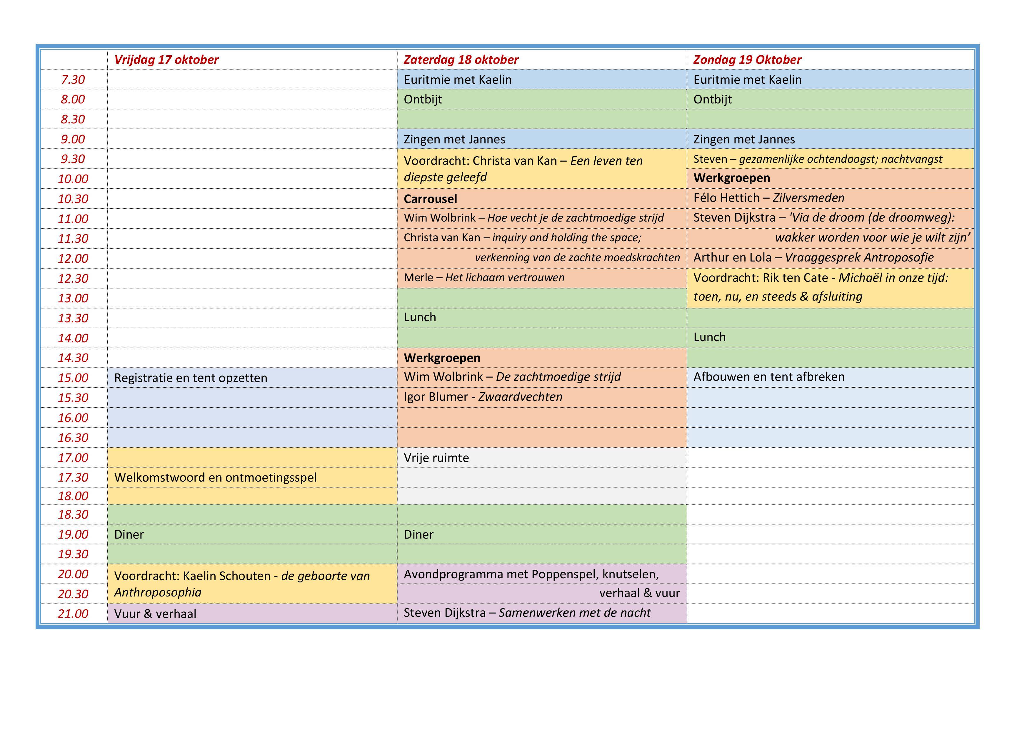 Hieronder vind je het programma van de Michaëldagen 2025. Elke keer dat een spreker of werkgroepleider bevestigd wordt, passen wij het programma aan. Zo kan het uiteindelijke programma, tot op het laatste moment, veranderen.